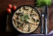 365/4 г • Куриные желудочки, жареные с помидором и луком в сметанном соусе
